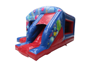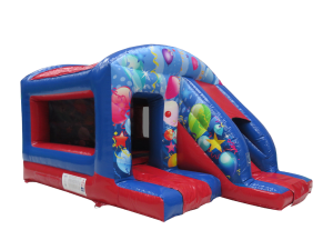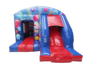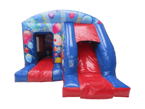 Bright, safe and party-ready. The Front Slide Combo Red Blue is a compact bouncy castle with a built-in slide and vibrant balloons-and-streamers artwork. Perfect for indoor venues. Stands 2.9m high. Ideal for children's party fun and lively corporate family events. Book with confidence for safe, enjoyable play. 🎉