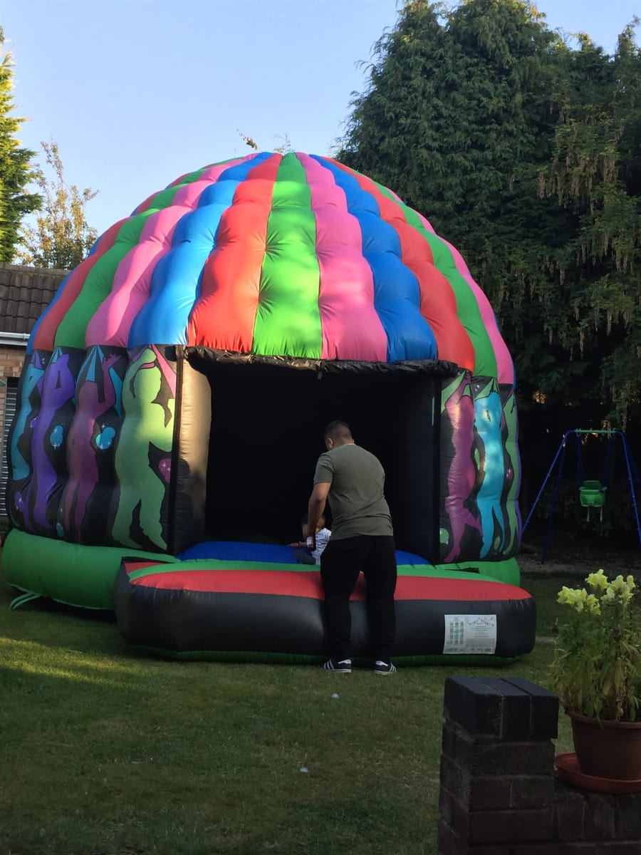 Latest phenomenon to the inflatable hire industry the "Disco dome" with flashing disco lights inside and a 120W speaker. The speaker connects to a blue tooth device ie mobile phone , ipads etc and then your in control of the play list.
