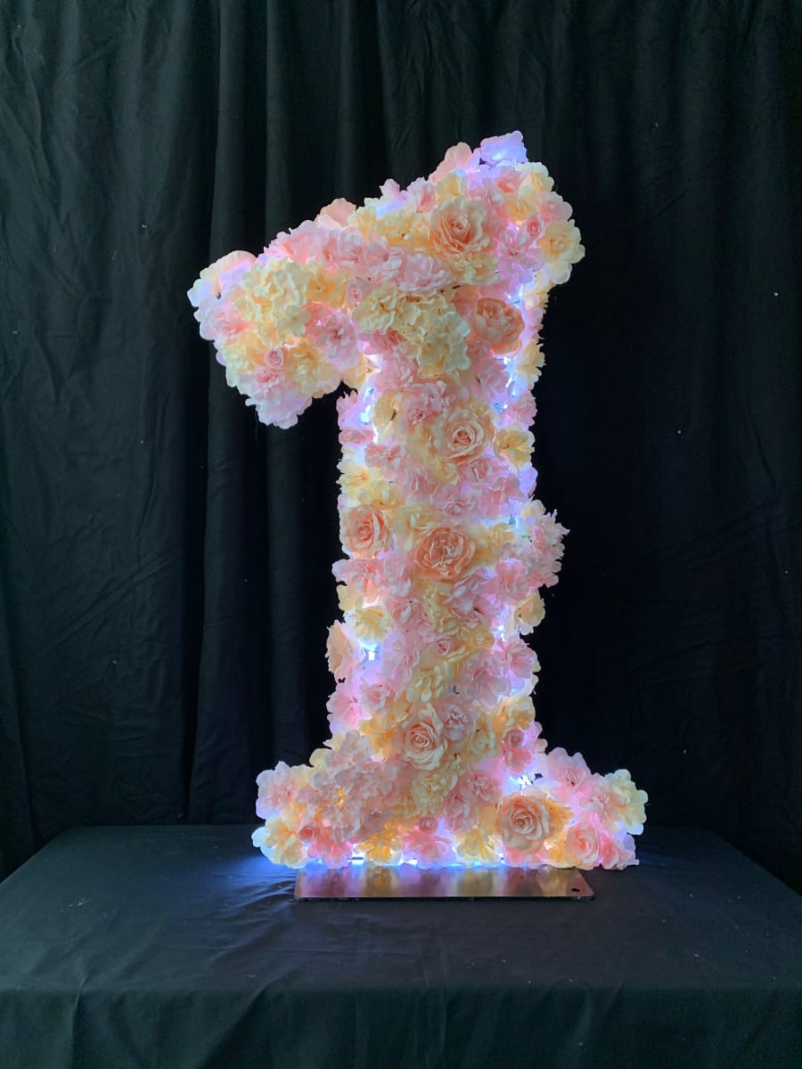 All alphabet and numbers / characters are available to rent in floral or glitter in brightly lit with LED Neon stpips. Free local delivery.