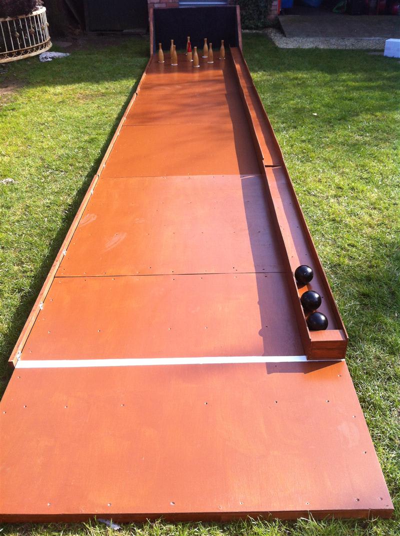 9 Pin Bowling Alley suitable for in and outdoors is great fun for all the family, suitable for pubs , clubs and schools . 27 feet long. Comes with 9 Pins , 3 Balls and instructions/ score sheets. Delivery areas in and around Birmingham,ideal for Private and Coprorate fundays.