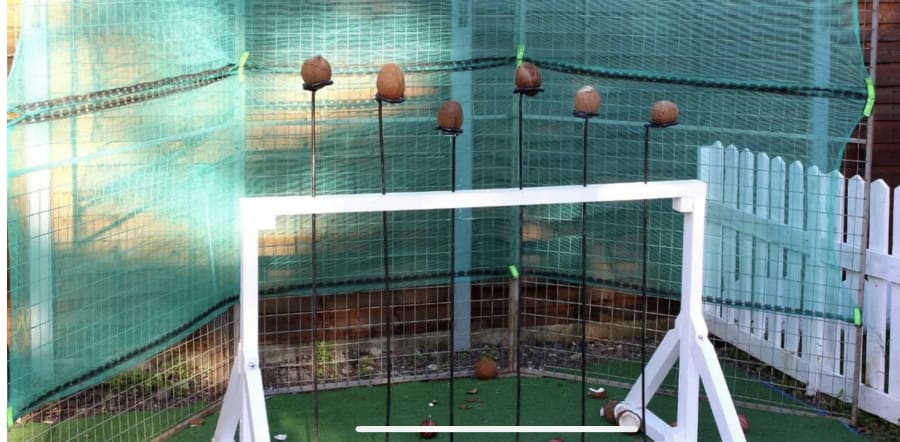 Its an outdoor game in which players throw balls at coconuts set up on poles in order to knock them down. You have 3 balls and take aim at the coconuts. At the back there is a wire fence with green netting to stop any miss-aimed balls going astray!
