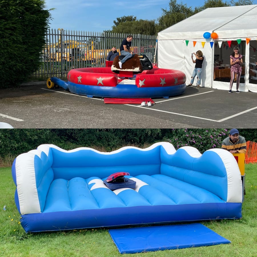 2 Great Simulators to hire as a package Rodeo Bull with a choice of attachments alongside the Surf Simulator